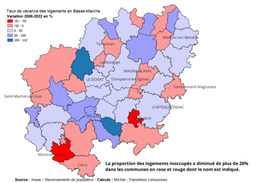 Dans ces conditions, et compte tenu de la faible pression démographique, il n’est guère étonnant de constater que le taux de vacance est très élevé en Basse-Marche. Dans les bourgs ruraux (encadré) du territoire, il est deux fois plus élevé qu’en moyenne métropolitaine. Entre 2016 et 2022, le taux de vacance des logements est certes resté stable à Châteauponsac et il a même un peu diminué à Magnac-Laval. Mais à Bellac et au Dorat, dont la population a baissé de près de 10 % entre 2016 et 2022, il a au contraire augmenté au cours de cette période. C’est une source de difficultés pour les propriétaires qui peinent à louer ou vendre une maison dans la très grande majorité des cas.